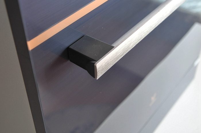 ▼洗碗机的柜门采用了下拉开门设计,把手内侧比较圆润,全铝合金材质坚固耐用更显高端,握起来比传统塑料的也更舒服。