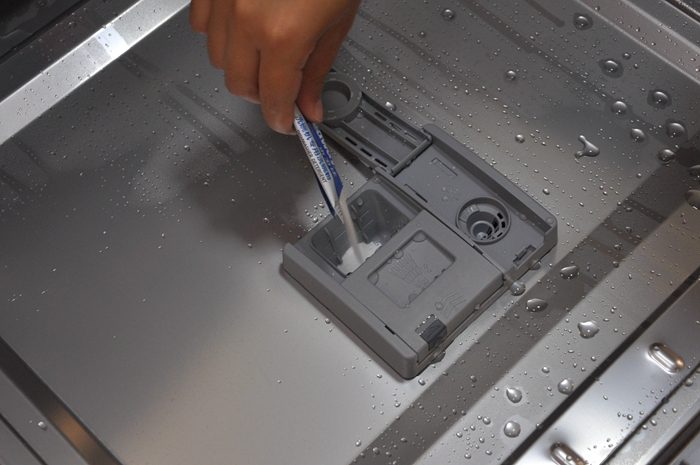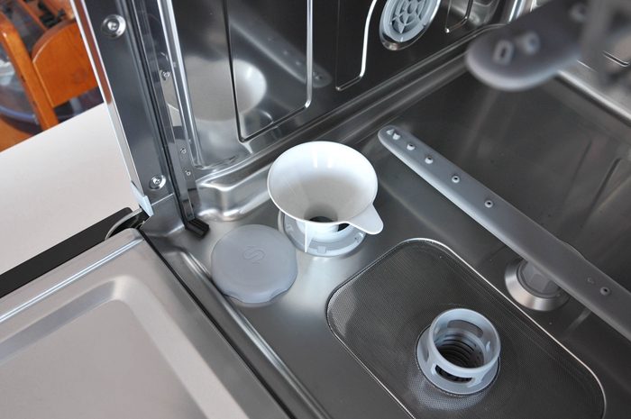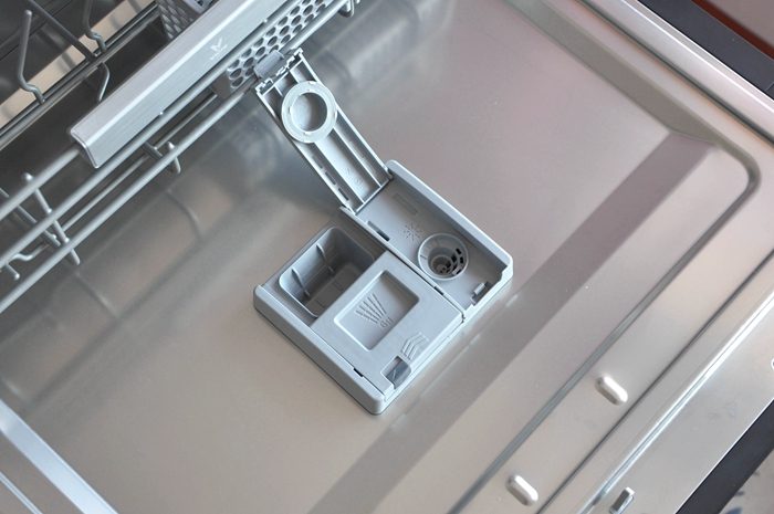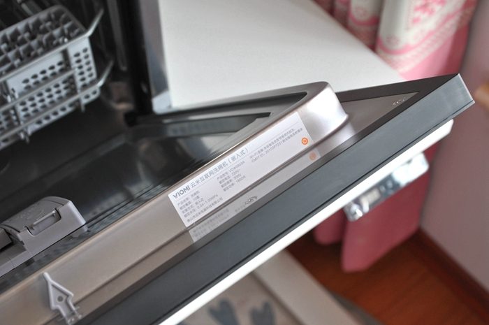 ▼柜门内侧贴有云米AI10套洗碗机lron A1的身份标签,通过这里我们可以了解洗碗机的详细参数。看到另一侧的水卫士洗涤剂二维码了吗,官方推荐使用该品牌,大家扫描二维码即可快速直达,非常方便。分配器位于柜门内侧,左侧添加洗碗粉/块,右侧添加亮碟剂,很容易区分。