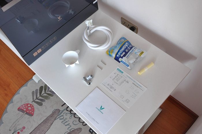 ▼全家福来喽,拆箱后除了云米AI10套洗碗机lron A1一台外,还有进水管一条,盐斗一个,三通球阀一个,安装螺丝两颗,防蒸汽贴纸一张,快速安装指引一张和使用说明书一本。还额外赠送了一包洗碗粉洗碟剂试用套装,足够满足日常使用啦。其实大家收到产品后无需开箱,待师傅来安装就好。