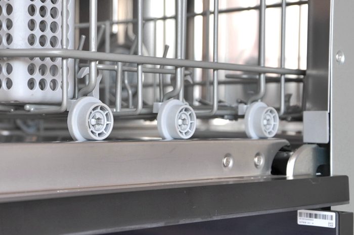 ▼滚轮特写,上下两个碗架抽拉都非常顺滑,上下层碗架都设计有限位装置,靠蛮力是无法完全拉出的,可以有效防止孩子们拉着玩,避免打碎餐具。
