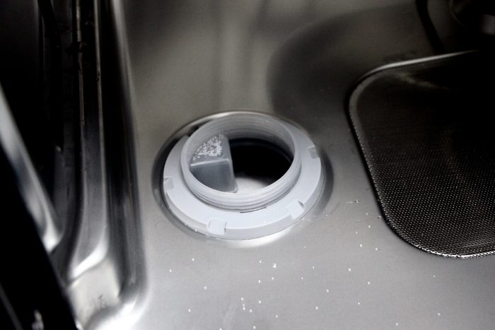 底部出水口旁边是添加软化盐的位置,这里要注意,这一款洗碗机并没有提供软化盐,你可以到一些平台上进行购买,并且它的价格并不是那么的昂贵。当然,它的作用是软化水质,防止水垢的形成。如果你没有添加的话,它会在显示板上或者手机APP上,提示你没有进行添加。