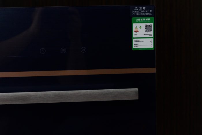 右上方贴着中国水效标识,达到了2级,这种水效标识说明了这一款洗碗机实际上它能够优化提高水的利用率,在节能模式下只需要9.5L的水量,能够更好的去节约用水。