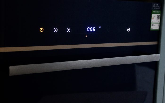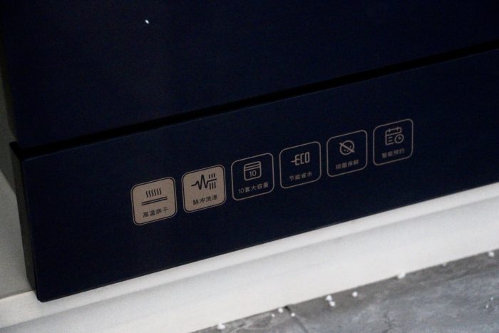 金属线条上方是触控按键,这里的触控按键它包括多种操控方式,包括快速洗,标准洗,节能洗,消毒洗,强力洗等等,满足我们多种餐具清洁和消毒的需求。