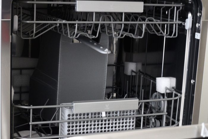 内部的整体纵深感很强,并且相对于上一代的云米嵌入式洗碗机,它的高度提升了30mm,并且它加高下势可调的空间,碗架推拉非常的自如,空间也更大。