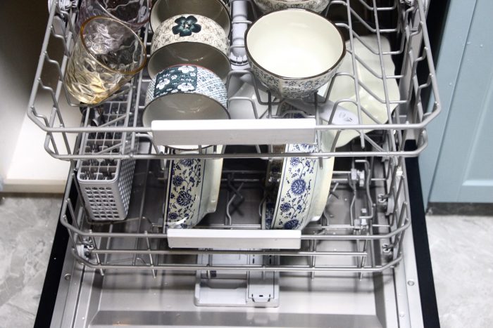 比如我们可以看到在洗碗机的上层碗架,可以轻松的放置多个碗;再看下层的碗架,每一排支架都能够放倒,轻松放置一些较大的餐具。