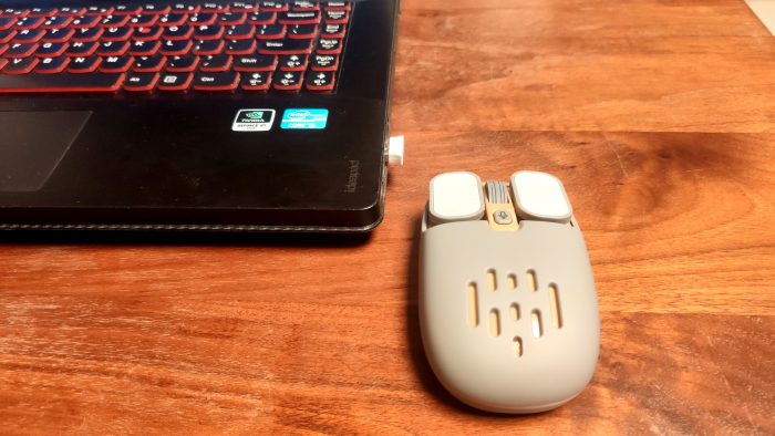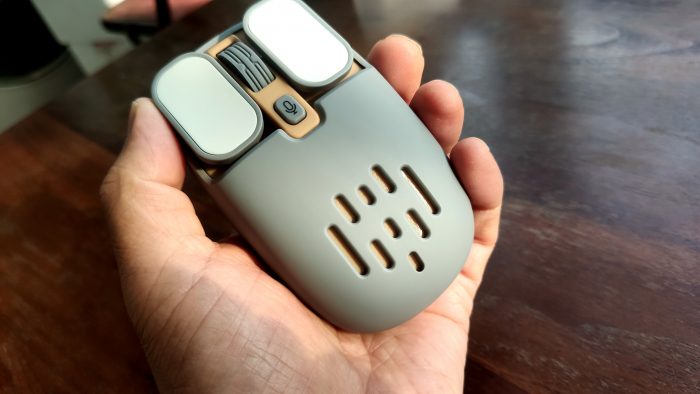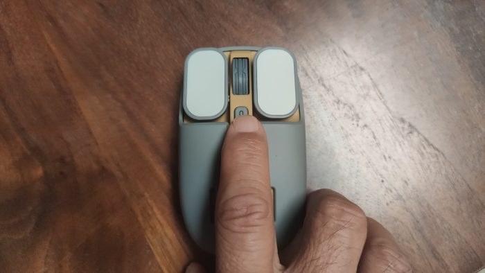 这款鼠标的配色是灰色加杏色,非常耐看;表面是经磨砂处理的亲肤材质,手感很好。左右按键颜色与鼠标本体不同,做了一个白色,便意与鼠标本体区分。左右按键做成了长条形状平板,手指头的感觉应该更舒适。