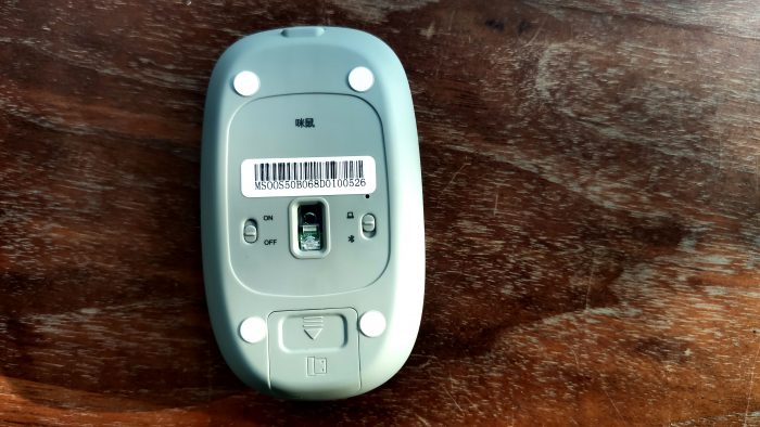 鼠标底部周边有4个白色小脚垫,中间位置是感光区,感光区两侧各有一个切换开关,左边是鼠标电源开关,右边是鼠标连接方式切换开关。连接方式有蓝牙连接和USB接收器连接两种。