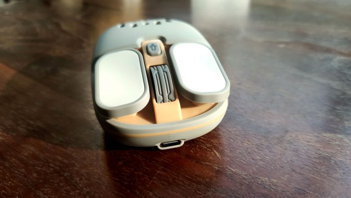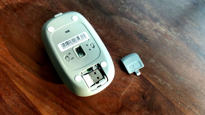 鼠标底部是鼠标USB接收器的存放位置,打开盖子就能看到白色的USB接收器。鼠标采用了锂电池充电设计,没有电池安装位置。