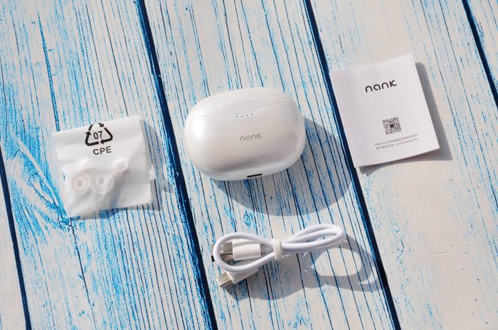 打开包装看到的就是塑料硬膜夹层全包裹的白色南卡A2的充电盒,包装里面分为了上下部分,上部是耳机的说明书、南卡A2充电盒,下部是充电线等配件。