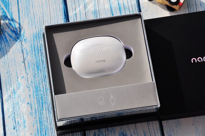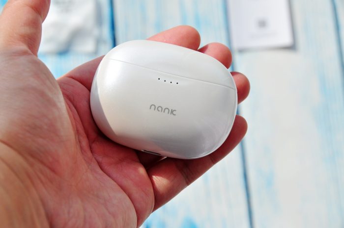 南卡A2的充电仓为开盖设计,正面中间四颗LED灯为信号指示灯,内部底部采用了磁吸触点,可以通过触点为耳机充电。仓体手感光滑,外壳表面做了抛光处理,盒体正面可以看到“nank”的LOGO,坚固耐用且轻量化。