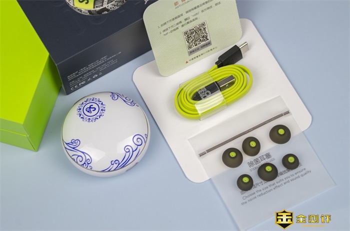 盒内是黑色泡沫内衬加磨砂防尘罩妥帖保护着圆形的耳机充电仓,配件方面除了质保凭证、说明书、荧光绿配色的连接线外,还附赠了大中小三套硅胶质地的除菌耳塞。