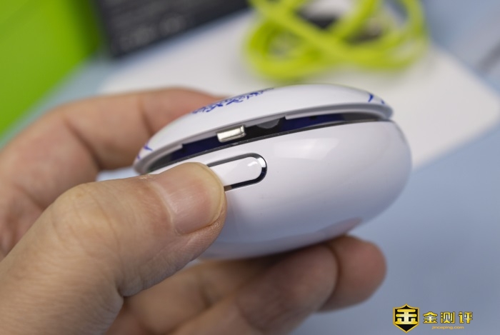 圆形的充电仓在真空电镀工艺及有着钢琴烤漆般质感的UV涂层加持下有着非常不错的视觉观感呈现,捏握细腻光滑的同时也有一定的防滑性,并且因为扁平的设计,捏握起来也比较受力顺手。