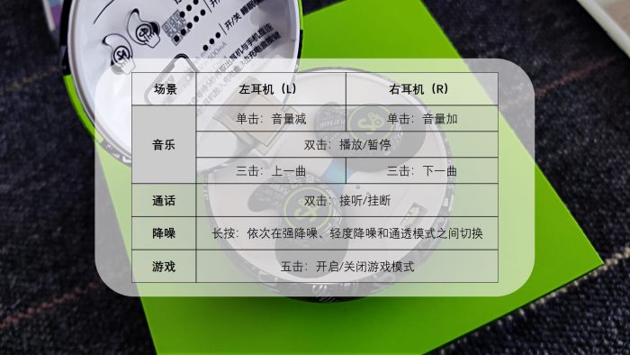 实际体验中,按下这枚按键,充电盒盖即可自动弹开,内置的三枚指示灯也可以实时显示电量,方便用户掌握充电的节点。有意思的是,在充电盒盖上,有一张印有简易操作说明的塑料膜,可以减少用户翻看说明书的频率,降低学习成本。