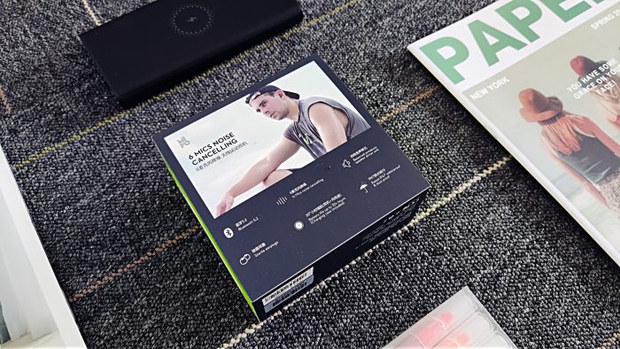 包装盒的背面配有佩戴耳机的宣传照片以及产品的主要卖点,包括蓝牙5.2、6麦克风降噪、动铁发声单元、除菌耳塞、30+小时续航和IP67防水防汗,相信这些卖点会得到日常坐通勤上下班的白领以及运动爱好者的青睐。