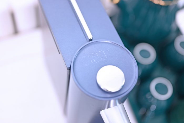 控制面板处的银色旋钮通过旋转调节温度,按压出水,这个旋钮的阻尼和手感都非常赞。