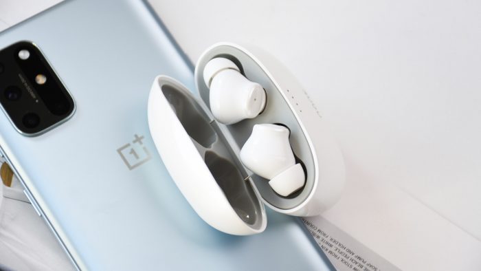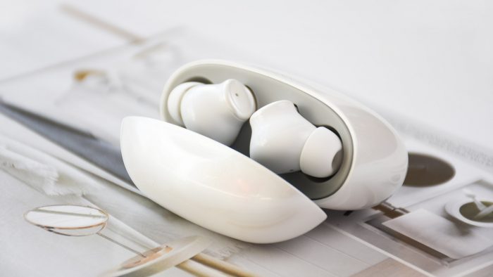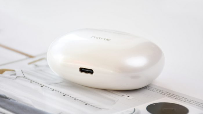 收纳仓的设计也十分有趣,整体造型圆润,像是一块鹅卵石的造型。采用与耳机柄外侧一样的白色珠光质感,整体给人一种珠圆玉润的印象。正面除了南卡Logo之外,还预留有四颗指示灯。