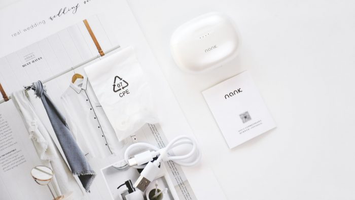 照例分享一组全家福,包含有南卡A2蓝牙耳机、充电收纳仓、Type C充电线、替换耳帽和使用指南。