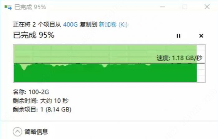 最后看下实际的写入速度 ,塞入一个大文件,约200G,开始到写入完,速度都非常稳定,保持在1.18GB/s上下浮动。