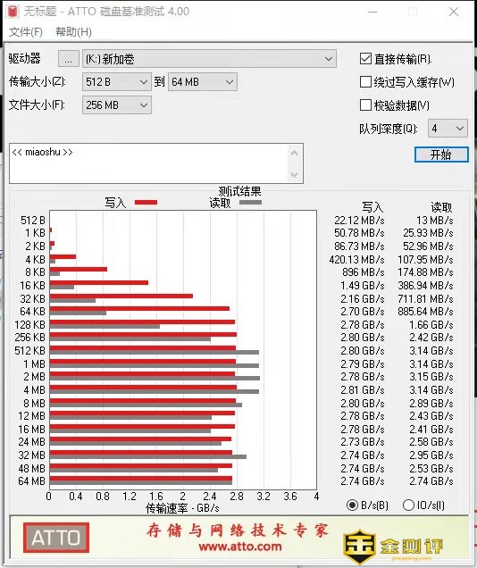 ATTO基准测试测试了256M写入和读取 ,每个软件的测评标准不同,我们不能从分数上来做对比,这个软件会更为直观的看到C900 PLUS的读写极限在哪里?稳定性如何。从柱状图看,在256K及以上时就到了写入极限,保持在2.78GB/s~2.81GB/s的区间。读取是在512B及以上时,保持在3.14GB/s的速度 ,会不会掉速,稳定不稳定一目了然。