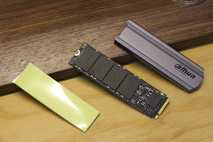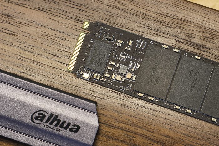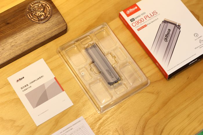 吸塑盒内的所有物品,浅灰色带大华LOGO的散热马甲,黄色的散热硅脂垫。中间的就是大华C900 PLUS固态,采用单面SMT贴片的方式 ,即将主控和存储颗粒及其它元件放在正面,这对于部分厚度有要求的笔电机型是非常友好的,安装兼容性更好些。同时正面并没有像大部分固态那样将品牌贴纸贴在存储颗粒上,而是放在了背面,这点是个人比较喜欢的,因为怕贴纸影响导热,一般有贴纸的上机前我都会撕掉。