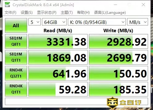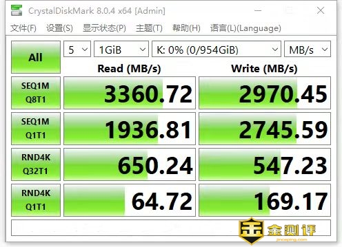 CrystalDiskMark进行测试,测试了空盘状态下两个极端1G和64G的情况 ,也可以做一些对比。测试得到的读取速度是3360.72MB/s, 写入速度是2970.45MB/s.和官方给出的读取3400MB/s 写入3000MB/s是非常接近的。60~65的4K读取跑分在无DRAM的SSD里是OK的了。在网上找了一下980 1T SSD的1G测试结果 ,两者是非常接近的,部分反而是有反超的情况 。当然这和每个人的测试平台有关,差异也会有,仅供参考。