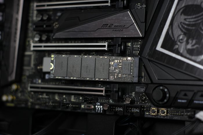 主板共有三个M.2固态接口,三个接口均自带马甲散热。随主板其实还有一张M.2 Xpander-Z扩展卡,也就说,这块主板最多可以安装5块M.2固态。主板上的三个M.2最高支持就是PCIe3X4的规格,与大华的C900 PLUS所支持的最高速率是一致的。