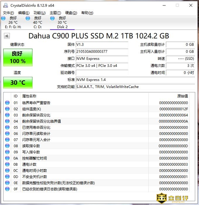 首先我们用CrystalDiskInfo来查看一下硬盘的使用情况,可以看到目前固件版本为1.3,接口标准NVMe1.4,传输模式PCIe 3.0x4,健康状态100%良好,待机温度30℃,与室温水平相当,加装散热马甲的确起到重要散热作用。
