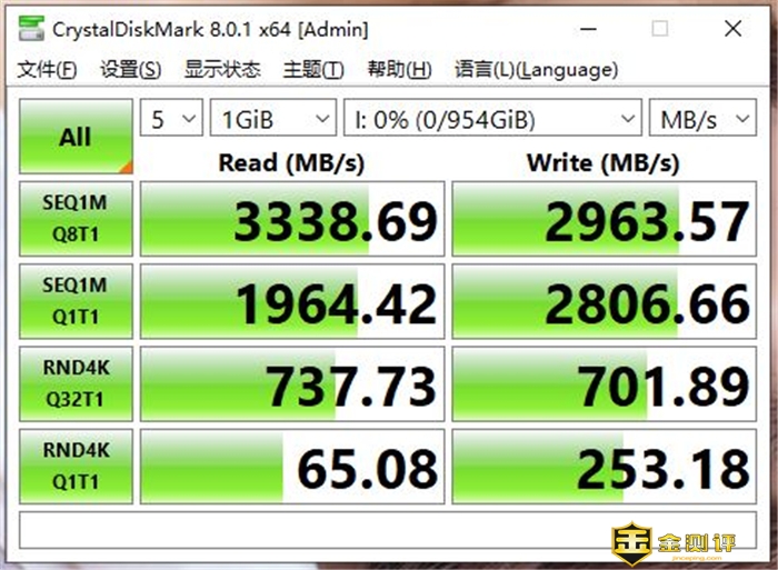 Crystal Disk Mark跑读写数据,顺序读取速度3338.69MB/s,写入速度可达2963.57MB/s,考虑到测试平台配置有所差别,数据上的小幅变化也在合理范围内。