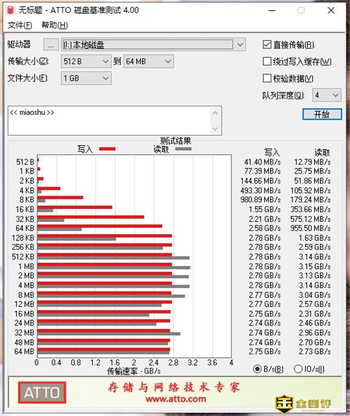 ATTO磁盘基准测试中,可以看到在1MB阶段达到峰值,读取数据3.15GB/s(粗估3150MB/s)、写入数据2.78GB/s(粗估2780MB/s)。