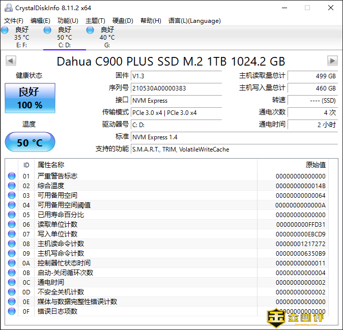 首先通过CrystalDiskInfo来查看大华C900 PLUS固态硬盘的基本信息,可见大华C900 PLUS运行于 PCIe 3.0 x4 模式下、支持 NVMe 1.4 标准。