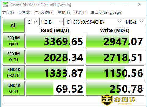通过CrystalDiskMark进行测试,1GiB 基准测试下顺序读取速度3369.65MB/s,顺序写入速度为2947.07MB/s,这样的性能表现也与官宣数据相差无多了,毕竟不同测试环境,不同配置测试结果有微弱差异也是可以理解的。