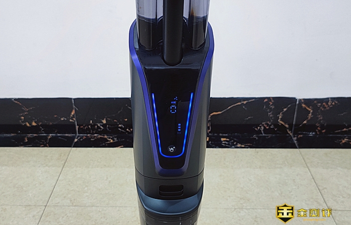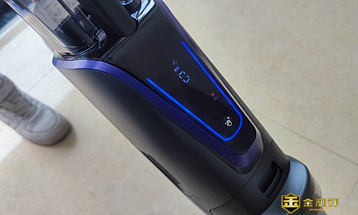 逸尘杀菌洗地机 2 Pro的主机科技感十足,它前面设置了可以显示洗地机的当前电量、当前工作的档位、自清洁时间等信息的显示屏,显示屏下方设置了自清洁按键和污水箱。