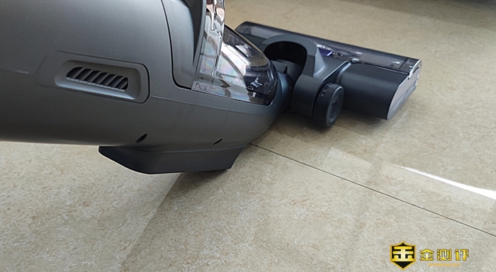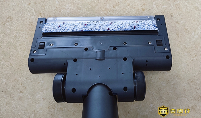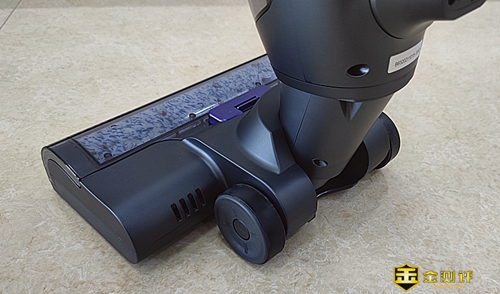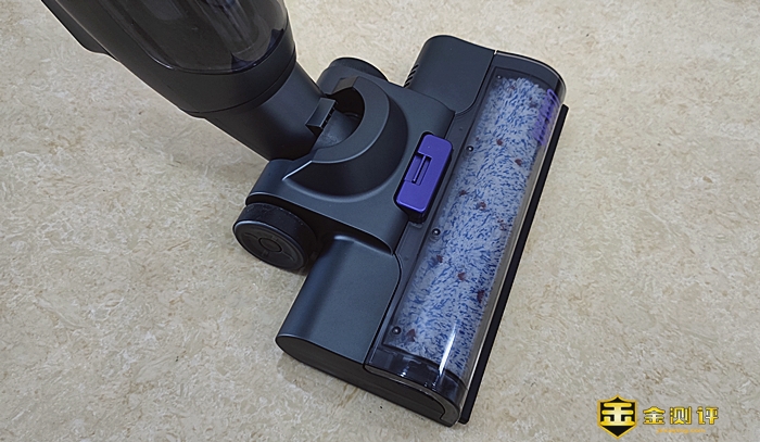 主机的地刷外观与其他品牌的洗地机地刷大同小异,在地刷前端设置了滚刷,滚刷上方设有了透明窗盖,滚刷的转动看得一清二楚。按下透明窗盖紫色锁扣,便可取下。