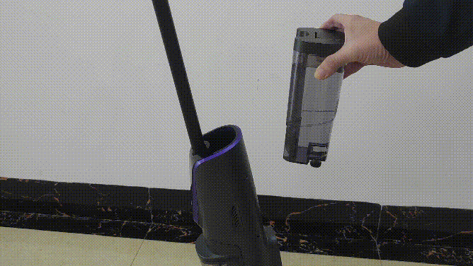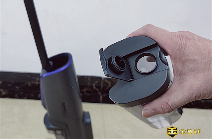 手拎住污水箱的手挽口,大拇指按下锁扣,向外轻拉,就能轻松从要机身取下。它安装也容易,把它底部置于机身开口处,然后向内轻推,听到“咔哒”声,就表示安装成功。