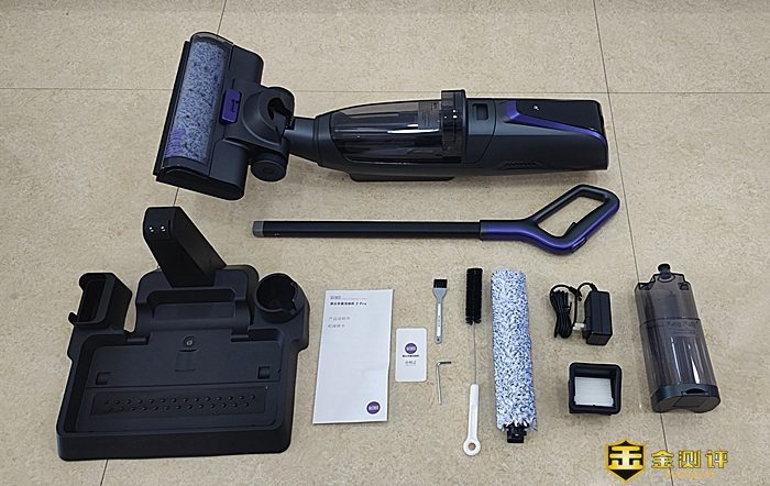 从箱子里可以取出逸尘杀菌洗地机 2 Pro的主机、手柄、清水箱、充电底座、滚刷、HEPAHEPA滤网、电源适配器、清理工具、HEPA清洁刷、板手、《使用说明书》和合格证。