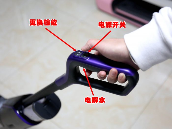 看完这款逸尘杀菌洗地机2Pro的清洁能力之后,我们再来谈谈这款洗地机的操作,机器所有的控制开关全部集成在手柄的握持部位!包含三个按键:开机键、换档键、以及一键喷水(