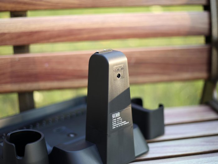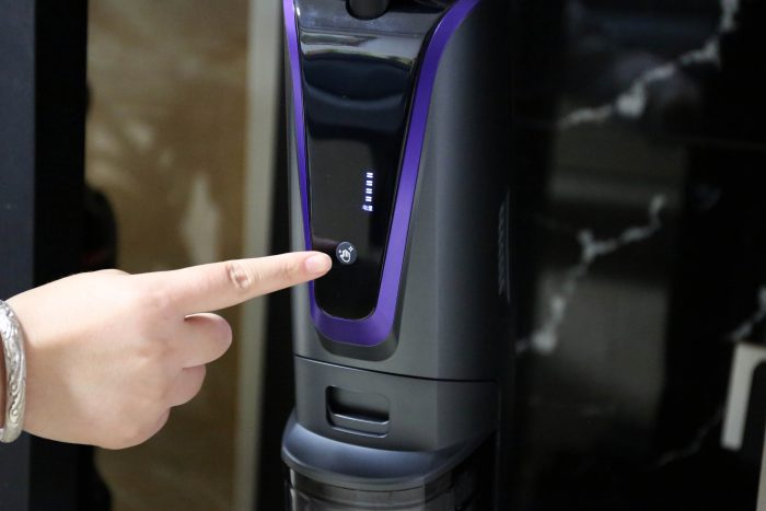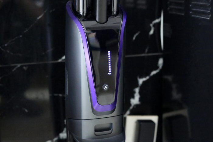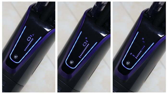 主机前端还有一个液晶显示屏,开机之后就可以看到相关数据显示,包含电量、吸力强度等等,后面体验环节会详细给大家演示,同时还支持语音发声功能。