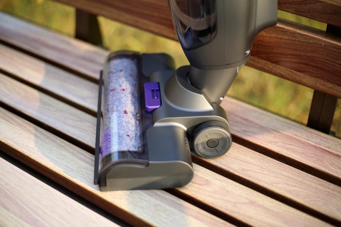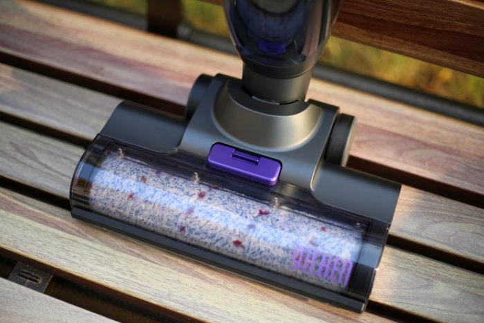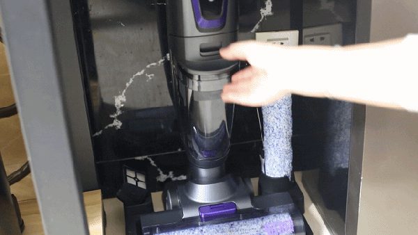 底部就是机器的清洁部分,可以看到这款逸尘杀菌洗地机2 Pro的滚刷上部采用了透明防尘盖进行遮罩,方便观察滚刷的使用情况。扣动顶部的紫色卡扣就可以对滚刷取下更换,或者单独清洁。