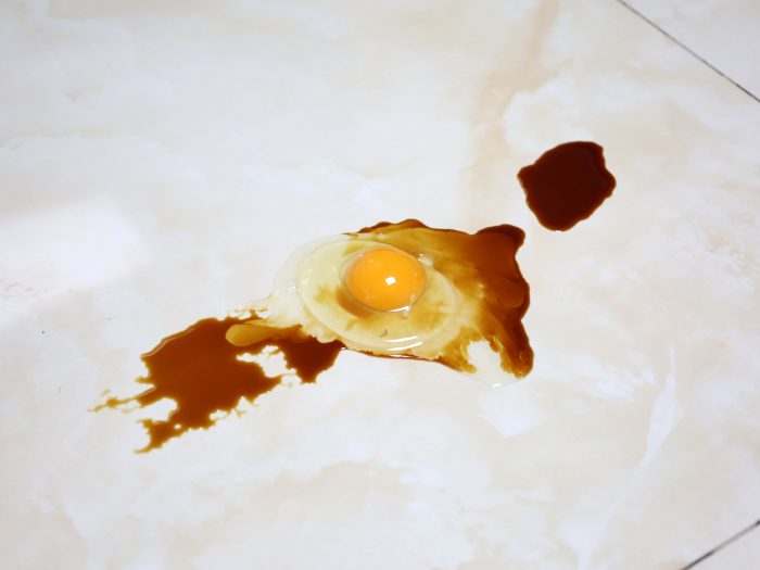 接下来是家里常见的湿垃圾,比如宝宝吃饭时不小心打饭的菜汤,以及一些污水污渍,为了增加难度,本人还放置了一个生鸡蛋,让垃圾的粘性更大,下面就一起来看看洗地机的表现。