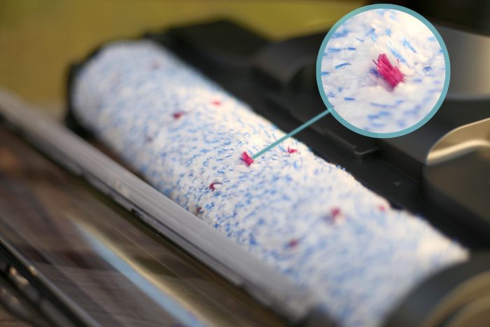 在这款洗地机自带的滚刷上,我们还可以看到这种突起的硬毛刷,配合机器的高速旋转和吸力,可以轻松擦去地面上的顽固污渍,让清洁更彻底。如果家里是木质地板害怕被划伤,还可以更换配件里附赠的全软毛滚刷。