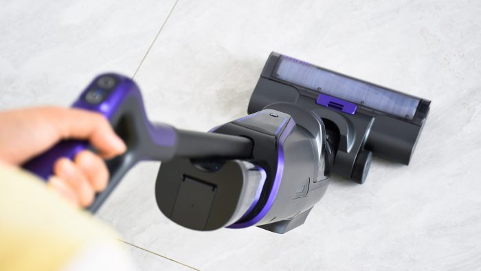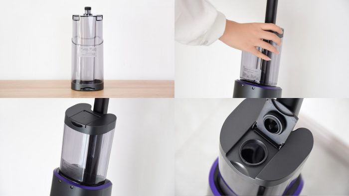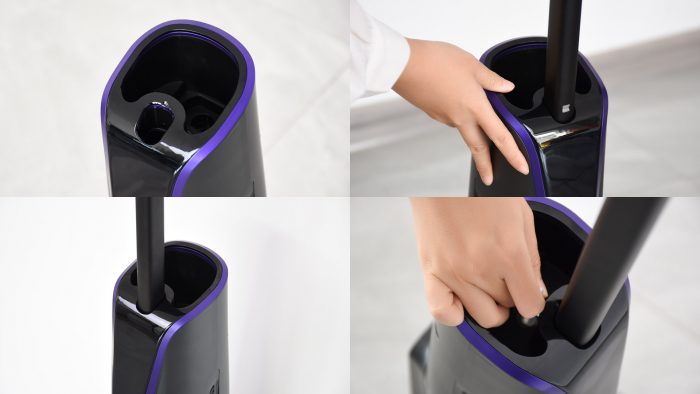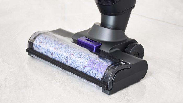 刷头部分比手持吸尘器宽大一些,但厚度上没有明显增加。按下上方的紫色卡扣可以取下透明盖板,将滚刷部分拆下来清洗或者更换。