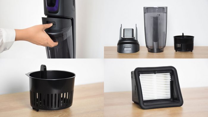 靠近刷头部分的是污水箱,容量是550ml,日常清洁完以后的污水会存放到这里,将清水和污水分开存储也能杜绝二次污染的情况。按下正面的灰色按键并向外拉动就可以取下污水箱,顶部搭配有过滤组件和专利滤网,通过HEPA滤网起到对灰尘和杂质起到过滤作用,防止灰尘吸附到电机中,同时滤网可以将干湿垃圾分离开,清洁水箱的时候更方便,不脏手。
