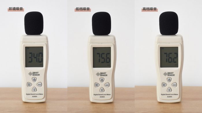期间我分别测试了高低两档工作模式下的噪音,同时附上环境噪音作为对比参考,具体数据如上图。