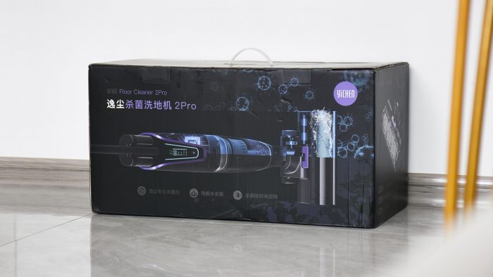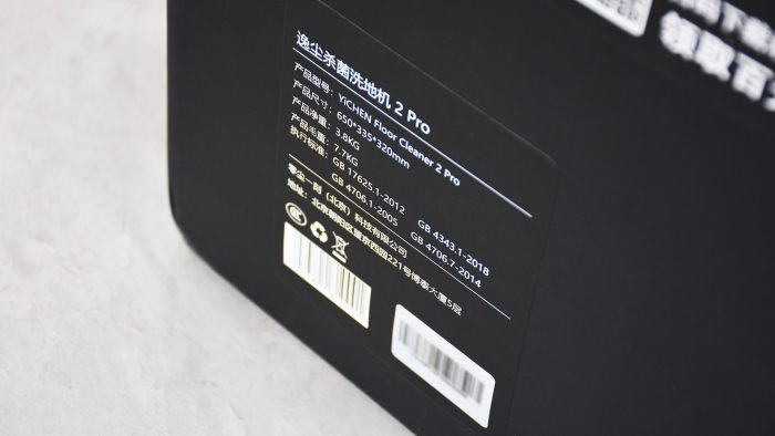 包装方面采用纯黑色的格调,正面印有洗地机清扫过后细菌和病毒被去除掉的示意图,突出这款洗地机的功能亮点。左上方标记有型号名称,右上角是逸尘品牌的Logo。