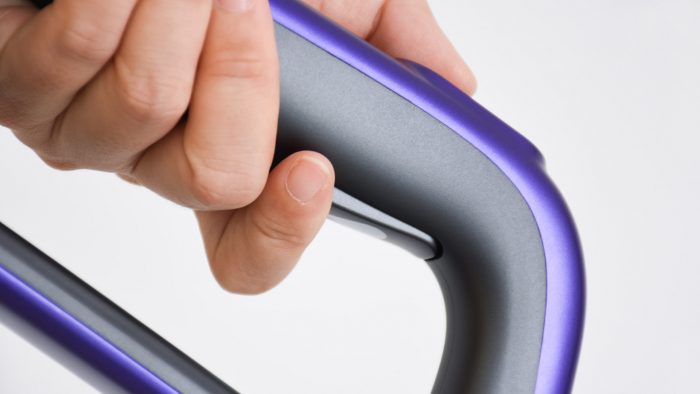 手柄的连接杆部分是金属材质,握持部是塑料材质。手柄部分设计成类似矩形的结构,保持一定的倾斜角度,握持的时候手掌顺势前倾抓住手柄,电源和档位两枚按键刚好处于大拇指的位置,方便操作。