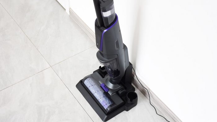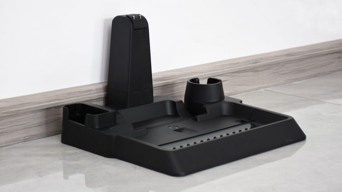 附赠的充电底座同样也是一体化设计,不需要组装,放在墙角连上电源线就可以。