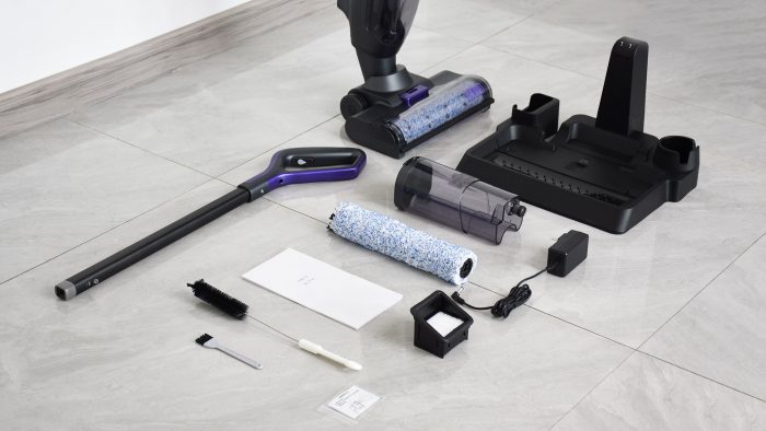 包装中有厚实的塑料泡棉填充,防止运输过程中磕碰损坏。包装内容比较丰富,包含有主机、手柄和连接杆组件、充电底座、HEPA滤网、HEPA清洁刷、滚刷、扳手、清理工具、电源适配器和使用指南等纸质文件。