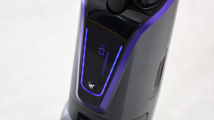 屏幕设计在机身正前方的位置,开机工作之后显示时间、电量剩余、水箱容量以及工作档位。屏幕下方手掌图标按键是自清洁键,清洁完毕以后放回到底座可以一键启动自清洁。不过将屏幕设计在这个位置,在使用的时候确实不太容易看见屏幕上的内容。不过这款洗地机也支持语音功能,操作的时候以语音的方式提醒倒也很直观。
