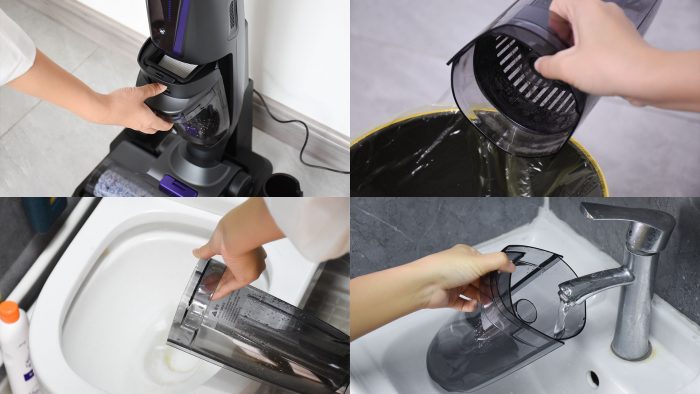 自清洁完毕以后开始回血充电,此时拆下污水桶,干湿垃圾分类存储。灰尘之类的干垃圾倒在垃圾桶里即可,污水桶里的脏水倒在马桶里就好了,有条件的话再用清水冲洗一下,善后工作也非常省力,双手无需沾染灰尘。