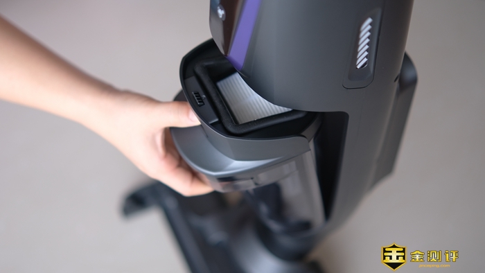 对清理出来的固体垃圾,在干湿分离滤网的作用下,干湿垃圾被分离,就像清理手持吸尘器一样,打开回收舱,如果使用了一次性不粘手滤纸的话,只要将干垃圾倒掉,简单清理分离滤网再装入即可,后续处理非常便捷,如果感觉专用滤网有灰尘残留,轻轻拭去就可保持清洁,一定记得装回去哦。